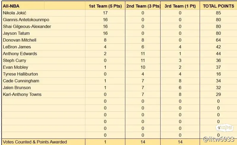 赛季最佳阵容最新投票情况,哈登大概率落选三阵了